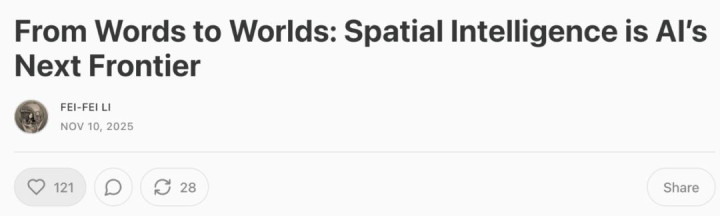 就在昨晚,关于其投身的空间智能,斯坦福大学教授李飞飞发表了一篇长篇博客《From Words to Worlds: Spatial Intelligence is AI’s Next Frontier》。